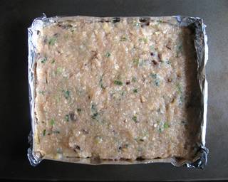- On the prepared tray, form the mixture into a 2-3cm thick square or rectangle.