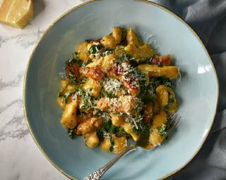 - Add the gnocchi to the boiling water. Once the gnocchi is cooked (when they float to the waters surface), drain off the water well and then add it in with the sausages and creamy spinach sauce. Toss everything together until evenly distributed and the gnocchi is coated. Serve up and if desired finish with a little grated parmesan. Enjoy. :)