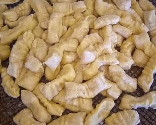 - Turn the mixture out of the bowl once combined into a lightly floured surface and knead. Knead until slightly tacky, elastic and quite smooth in texture. Round off into a large ball and cut into quarters. Take one quarter and roll it out into a long sausage shape. Cut into 1 inch pieces all along its length. Dust over a tiny bit more flour if needed.
