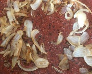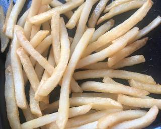 - Cut one onion into slices and fry, put some fries in the oven and cook as per instructions