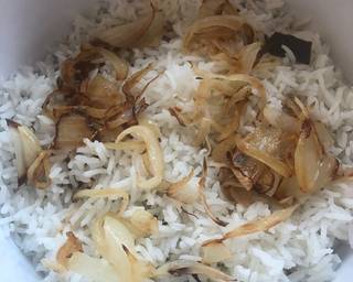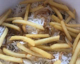 - Now you can layer, start with lamb, add half the rice then add half onions and 3/4 chips small amount of rice then lamb again and rest of chips