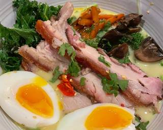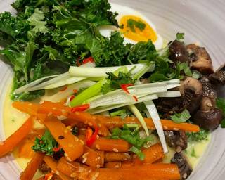 - Finally reheat the leftover pork (or make some crispy tofu). Then assemble the dish by putting the noodle soup in a deep bowl, adding a little of each vegetable, the meat / tofu and egg. Sprinkle over the spring onions, chilli and fresh coriander and serve.