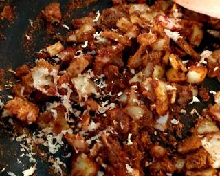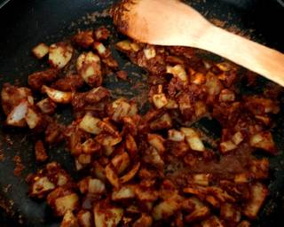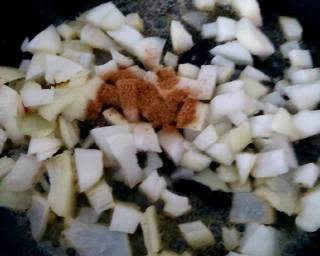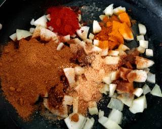 - Next add Ginger, Garlic, Cumin, turmeric, coriander, curry powder, chilli, and stir in add the oil fry for 1 minute.