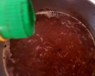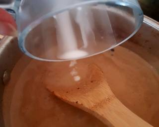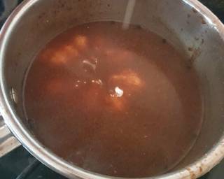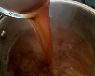 - Next add the beef stock mixed in the boiling water. Then add the pepper Dijon mustard and whole peppercorns.