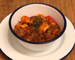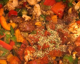 - Add the chopped vegetables, cooked chorizo, chicken and creole spices (see ingredients). Cook for 10mins on a medium heat