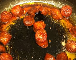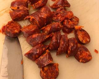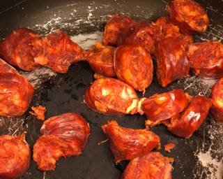 - Chop the chorizo. Place in a hot pan and cook to release the oils
