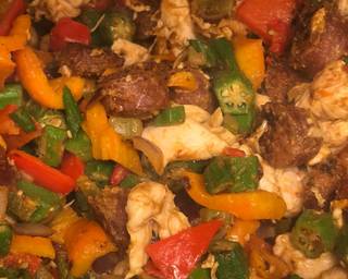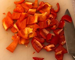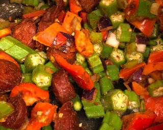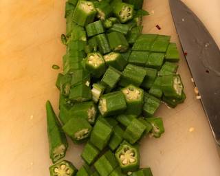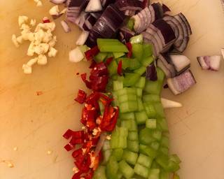 - Chop the peppers, onion, garlic, chilli, celery and okra