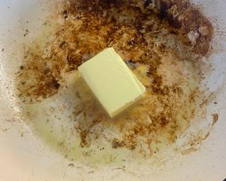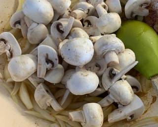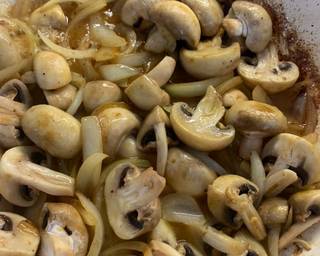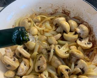- In the same pan add the butter, let it foam and throw in the onions and mushrooms.