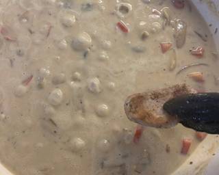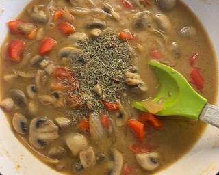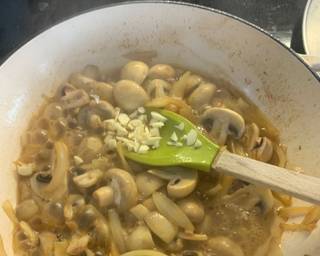 - Glug in the Sherry, add the mushrooms stir well to simmer down the liquid.