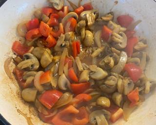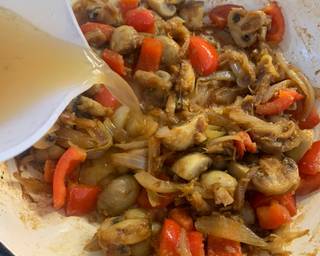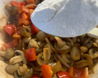 - Put the peppers in stir well and take off the heat. Add the flour and stir coating all the veggies.