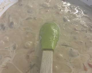 - Pour in half the stock, stir well and turn the heat so it thickens, then add the rest of the stock stirring out the lumps.