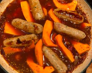 - Add the beef stock and bring to the boil. When simmering add back the sausages and the sliced squash
