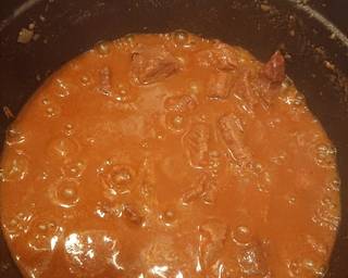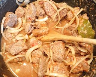 - Add the garlic, bay leaf, onion, tomato paste and broth to the pot. Stir to combine and cook for another 3-5 minutes then reduce the heat to medium-low and simmer for 2 1/2 hours to 3 hours or until meat is soft and tender. Add water as needed when it starts to dry.