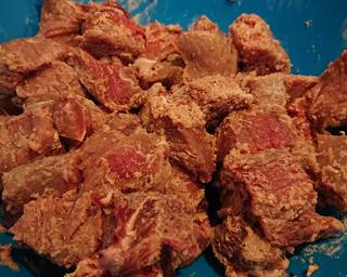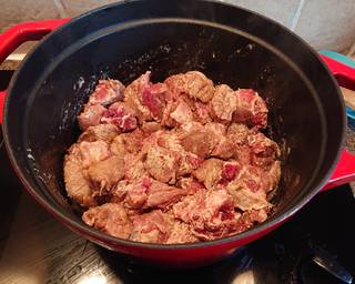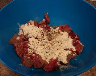 - Toss the beef with the flour, salt and pepper in bowl until all the pieces are equally coated.