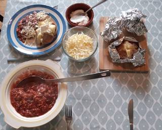 - Let everyone serve themselves, some might want to have everything piled into the potato, topped with cheese and soured cream, while others may want the soured cream on their potato and their chilli on the side, with or without cheese. Maybe they will even want the cheese on the potatoes, followed by the chilli. The beauty of this dish is the number of ways it can be served, keeping everyone at the table happy 😊