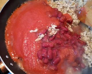 - Add the tin of beans in chilli sauce and the passata and continue to cook for a further ten minutes. Add a splash or two of water if it gets too thick or a bit sticky.