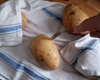 - Wash and thoroughly dry the potatoes and prick them all over with a fork.