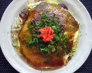 - Meanwhile, cook Yakisoba Noodles in another frying pan, with a small amount of Oil. Season with Salt & Pepper, OR/AND Okonomiyaki Sauce. Carefully transfer the whole pancake, as Pork slices are facing down, onto the Noodles.