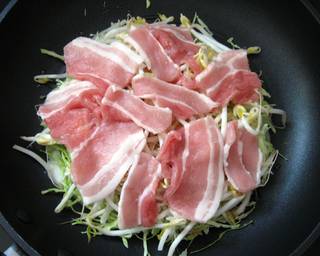 - Sprinkle with the crumbled Katsuobushi (Bonito Flakes) (*optional). Place thinly sliced Cabbage, Bean Sprouts and ‘Tenkasu’ (OR the substitute), drizzle the saved batter over, and cover with Pork slices. Sprinkle with Salt & Pepper.