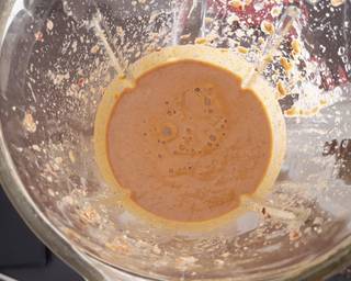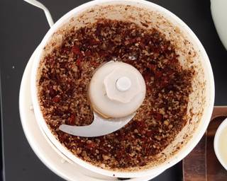- After grind the sesame seeds, cumin seeds, dried red chilli and garlic transfer them into a blender then add chopped tomato, coriander, ginger paste, salt, turmeric, sugar, oil and water into a blender. Blend them all together until become smooth.