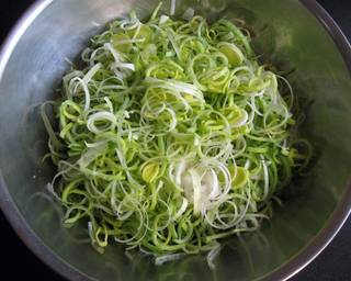 - Clean the Leek, especially green parts need to be carefully cleaned. Thinly slice and place in a large mixing bowl. Today I had about 460g of sliced Leek. *Note: You can use most of parts of the Leek, so do not waste green parts.