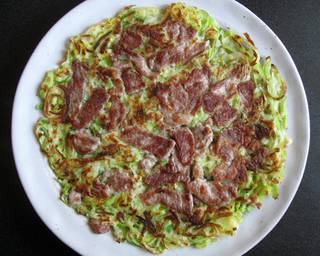 - Oil a hotplate or a frying pan and cook 1/2 of thinly sliced Pork on both sides. Spread 1/2 of the Leek mixture over the Pork pieces to form pancakes.