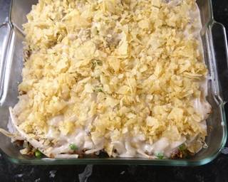 - Break up the packets of salted crisps into finely broken peices and spread out evenly over dish