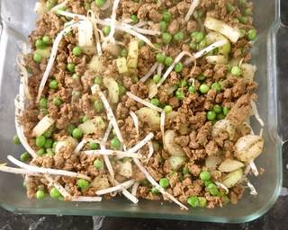 - Place the and mix the cooked mince, frozen peas and celery in a casserole dish and pour over the sauce made in 2. Throw in some Beansprouts if you have some!